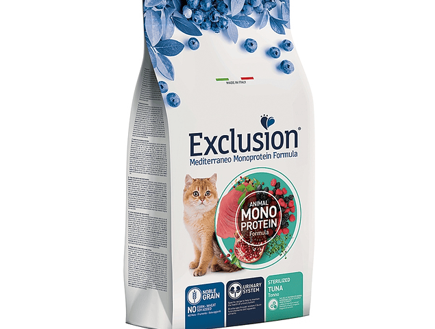 Exclusion Mediterraneo Monoprotein Formula - Noble Grain é um alimento completo e balanceado, formulado com uma única fonte de proteína animal desidratada, para uma receita clara e essencial, e com apenas um cereal nobre de alta qualidade. A formulação específica auxilia no bom funcionamento do trato urinário e é preservada com antioxidantes naturais. É elaborado com uma receita inovadora com Superfood da tradição mediterrânea: romã, amoras, framboesas e mirtilos. É enriquecido com Psyllium para ajudar a neutralizar a formação de bolas de pelo.