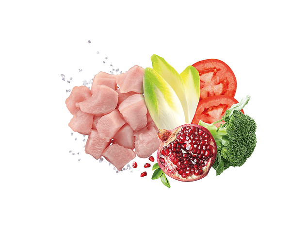 Exclusion Mediterraneo Monoprotein Formula - Noble Grain é um alimento completo e balanceado formulado com uma única fonte de proteína animal desidratada, para uma receita clara e essencial, e apenas um cereal nobre de alta qualidade. É preservado com antioxidantes naturais e complementado com betaglucanos. É elaborado com uma receita inovadora de Super alimentos de tradição mediterrânea: Cânhamo, Azeite, Tomate, Romã, Brócolos e Chicória.